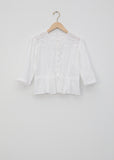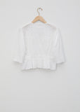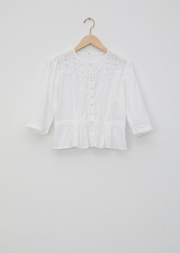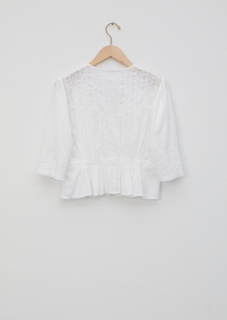 Mimi Prober’s Barton peplum blouse is sustainably crafted in New York from gathered panels of white organic-cotton voile and tonal insertion lace with crochet-covered buttons down front.