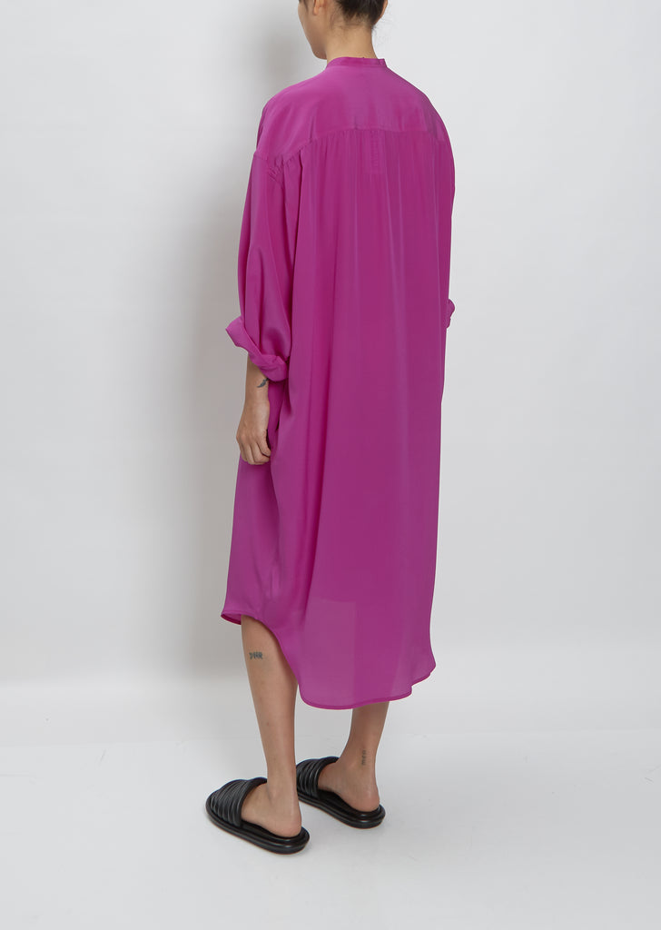 Moniquevanheist fuchsia pink button-down shirt dress with a small band collar and single chest pocket in a fluid silk crepe.