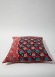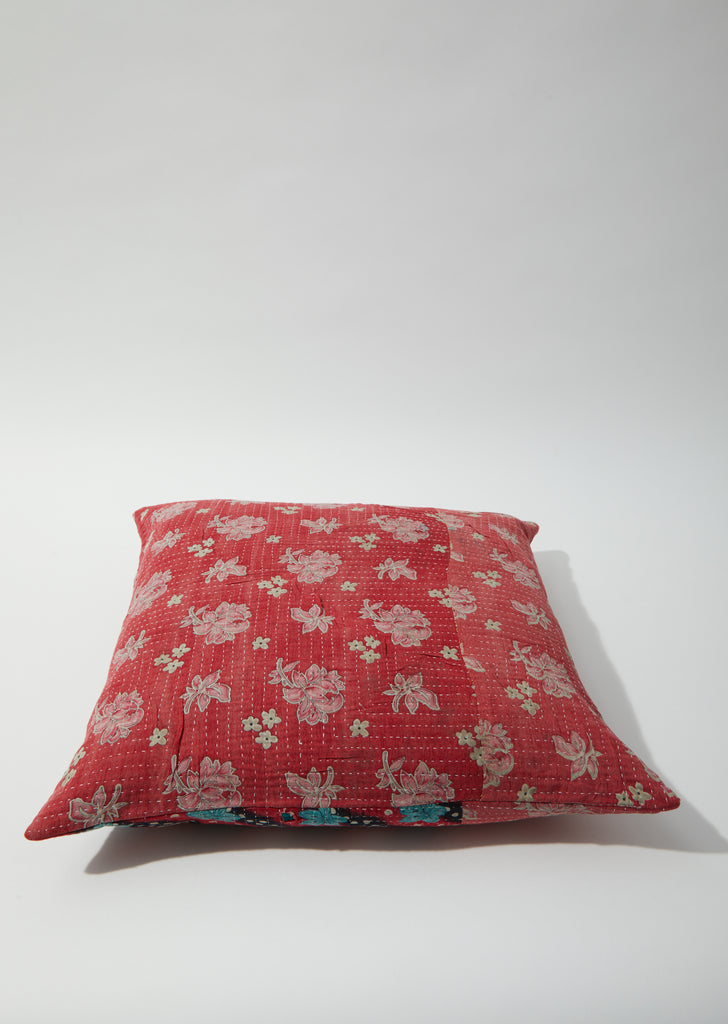 Handcrafted in India, Auntie Oti’s double-sided square patchwork cushion cover is made from upcycled cotton khadi. The plain-woven textile is printed with floral patterns of red, pink, blue, and mauve. All-over kantha running stitches in concentric rectangles lend a graphic finish.
