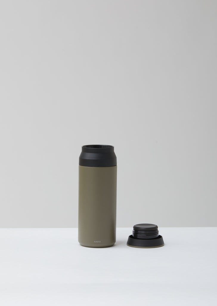 Khaki powder-coated vacuum flask from Kinto. Modern and functional design with flow-regulating 360° lip for natural flow. Keeps drinks hot or cold for up to 6 hours. Leak-proof cap.