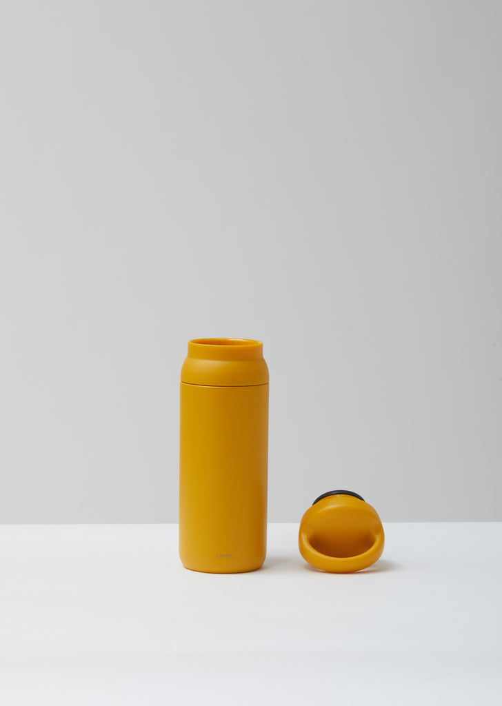 Mustard powder-coated stainless steel travel tumbler from Kinto. Double-walled stainless steel and vacuum-insulation keeps drinks hot or cold for up to 6 hours, all encompassed in a seamless, monochromatic design. Dual-lid handle stops ice cubes while being easy to clean.