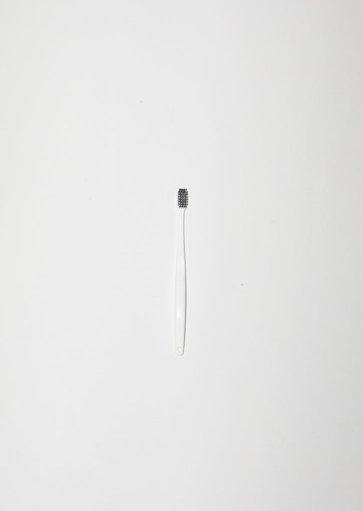 White toothbrush with activated Binchotan charcoal bristles. Charcoal’s absorptive power deodorizes your mouth and removes the plaques. A novel alternative to messy charcoal toothpaste.