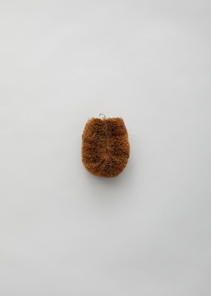 Horseshoe-shaped scrubber brush hand-crafted of durable, water-resistant palm fibers. Ideal for preparing root vegetables and for scouring residue from cookware. The biodegradable fibers, though stiff, are gentle enough for most sensitive surfaces. Finished with a metal ring for hanging and air-drying.