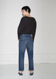 This classic five pocket denim has a perfect relaxed fit, and just the right crop with a worn-in look, and slightly distressed finish. Zipper fly, button closure. Finished with belt loops at the waist and a logo patch in back.