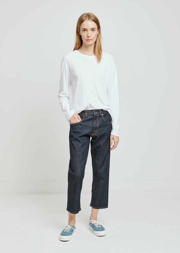Dark blue selvedge denim jean crafted in Italy, with a subtle drop rise. Cropped, slightly baggy fit. Classic five-pocket styling. Contrast topstitching throughout. Copper-toned rivets. Button fly closure. Color: Selvaged Rinse. 100% Cotton. Made in Italy.