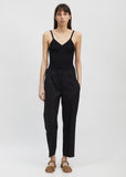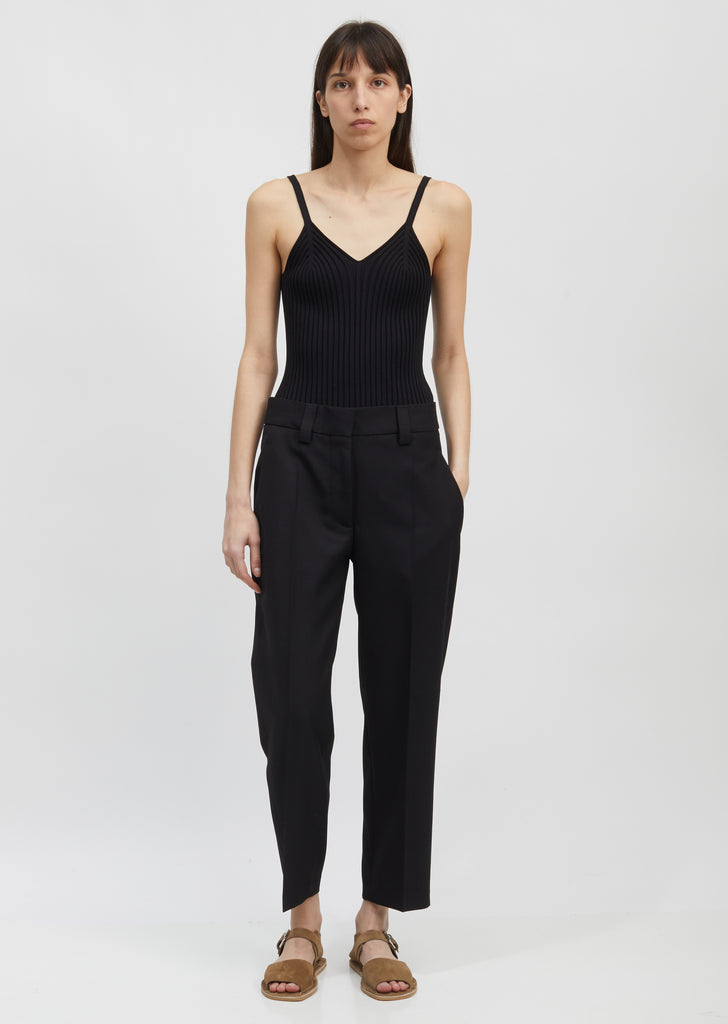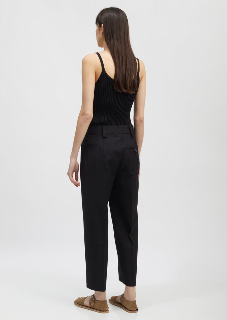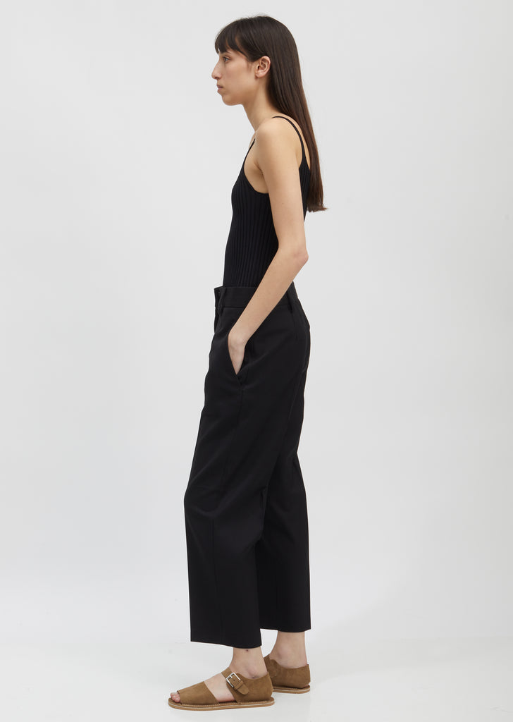 Black mid-rise trousers in a lightweight tropical wool-blend fabric with wide belt loop detailing on clean, wide waistband.