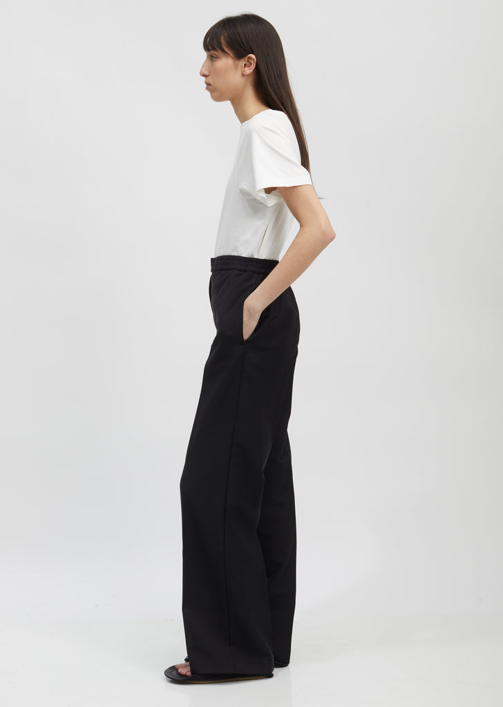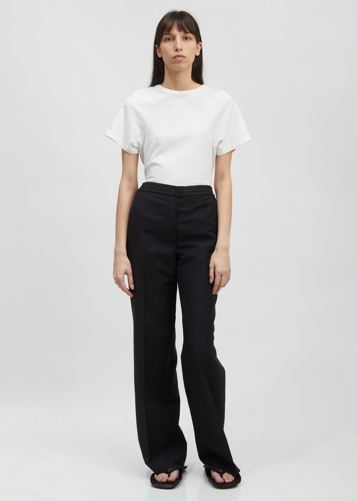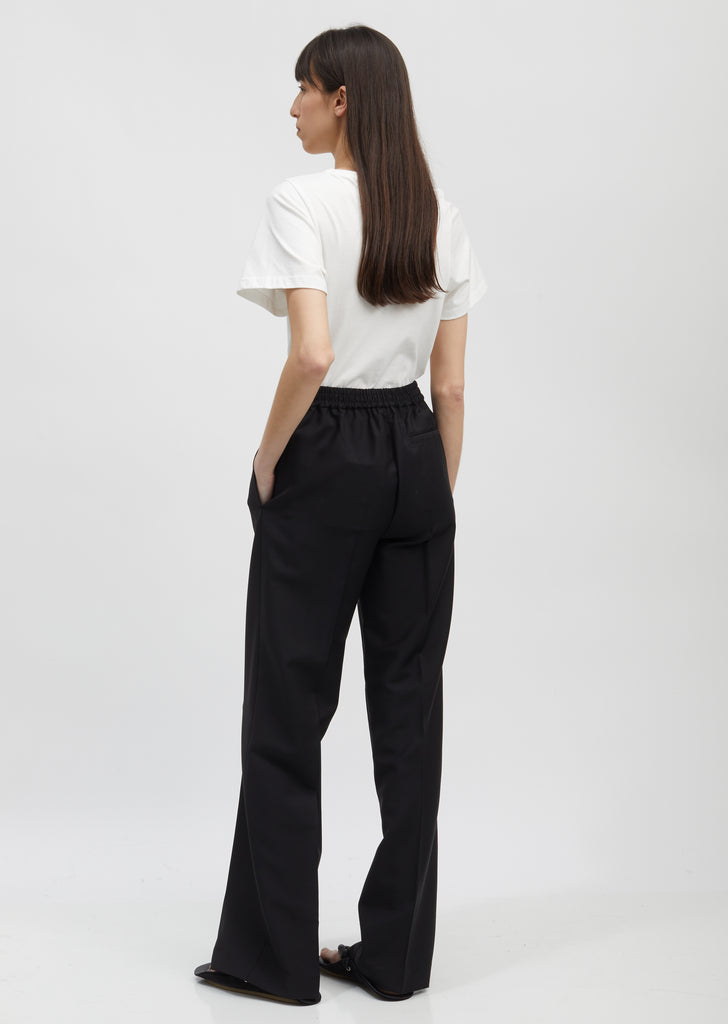 Black wool-blend pants with an elasticated waistband that fastens with an interior drawstring, side pockets, a slit pocket at the back and a central crease at the leg.
