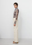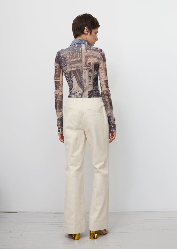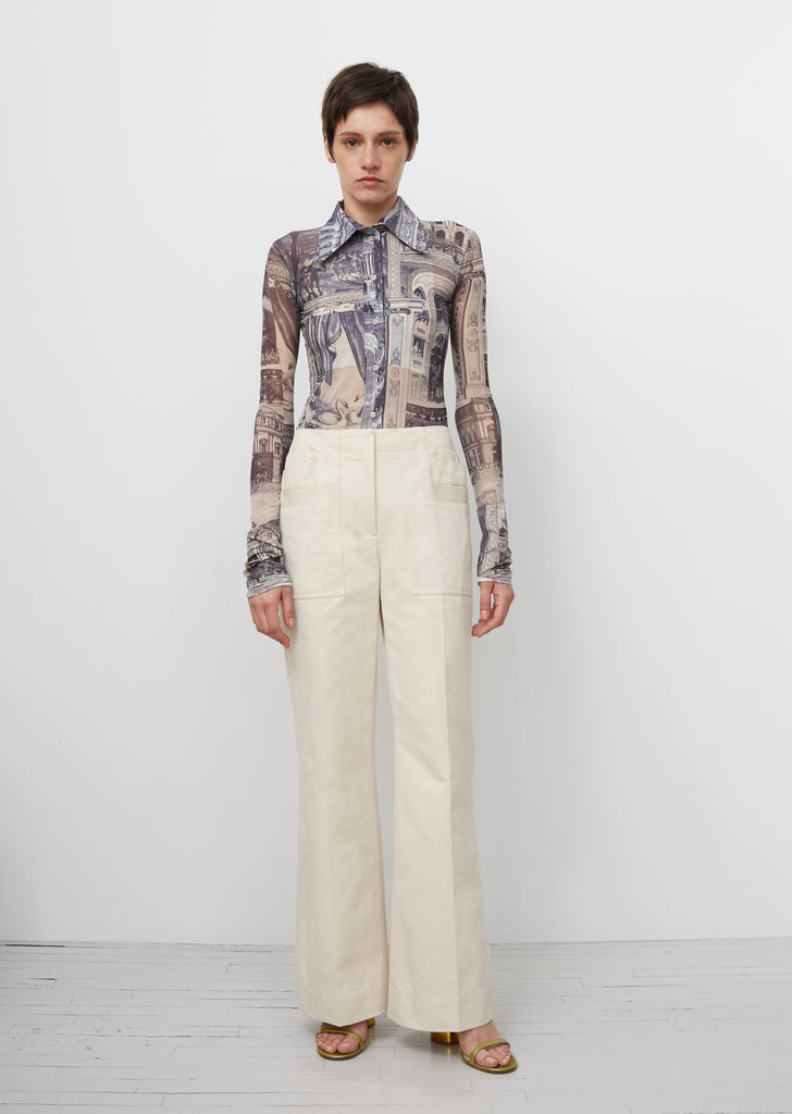 Ivory white cotton drill trousers with angled and flat patch pockets and subtle kick flare leg with pressed creases. Wide welt pockets at back. Concealed hook, eye, and zipper closure. Relaxed, kick flare fit.