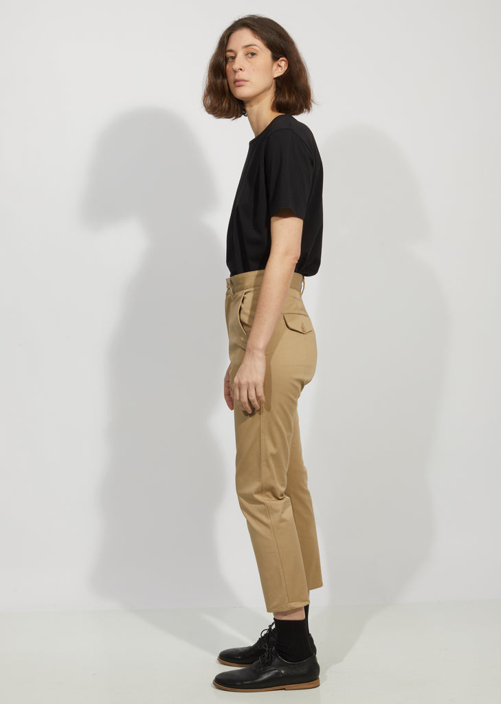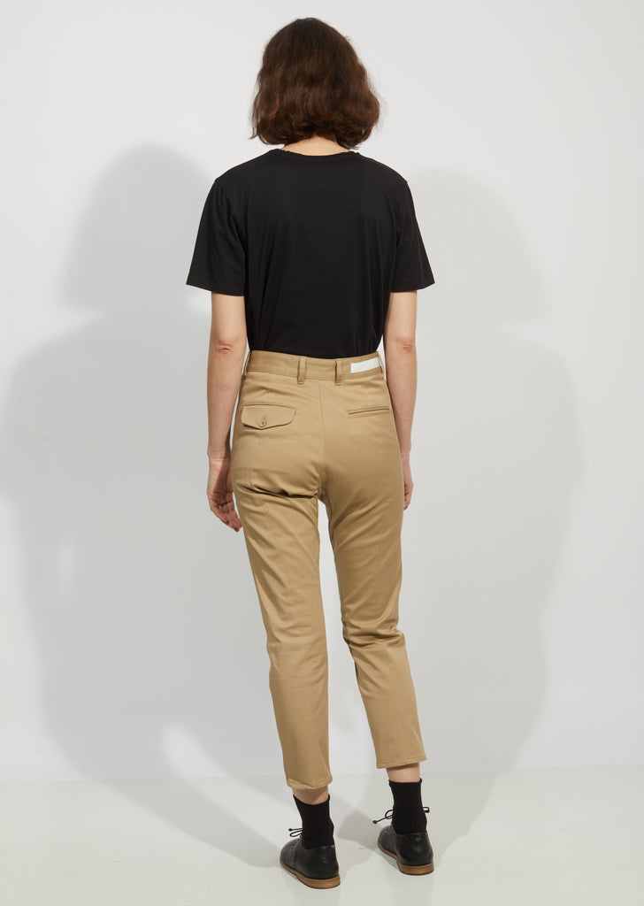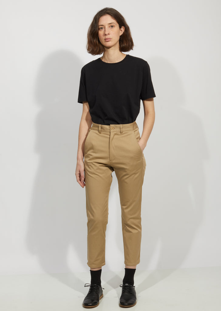 Golden-beige unisex slim-fit pants in mercerized cotton twill, cropped at the lower calf.