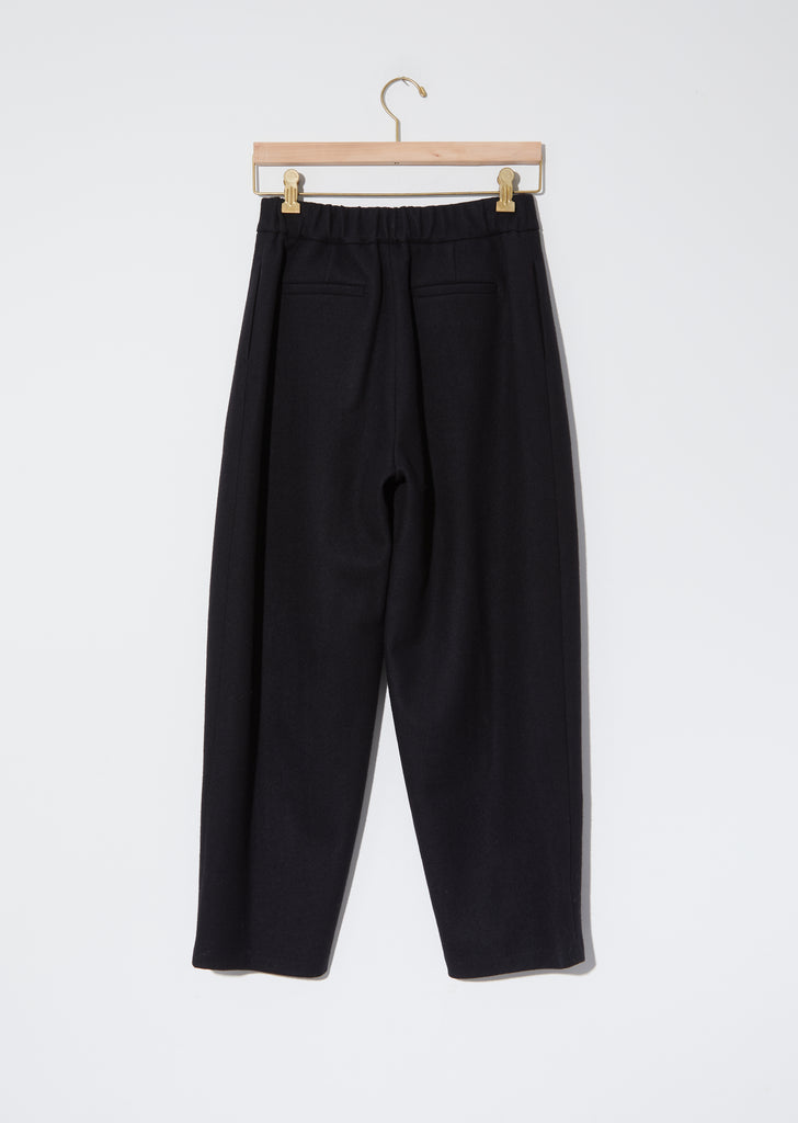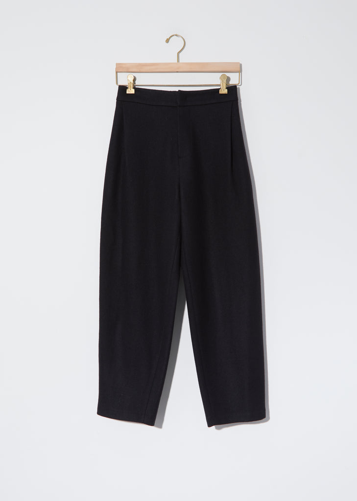 New Designer — Amomento Garçonne Wool Pants in Black. Wool tapered leg trousers with flat waistband at front and elastic waist at back, featuring a tuck detail at front sides for a subtle balloon shape leg. Coordinates back to the Rounded Shoulder Jacket in the same fabric for a winter suit.