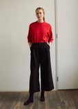 Cropped wide-leg pants crafted from black cotton twill, stab-stitched sashiko-style with tonal vertical stitches. Mid-rise. Gathered grown-on waist. Belt loops. Yoke back waist. Zip fly. Button closure. On-seam side pockets. Cropped just above ankle. Relaxed fit.