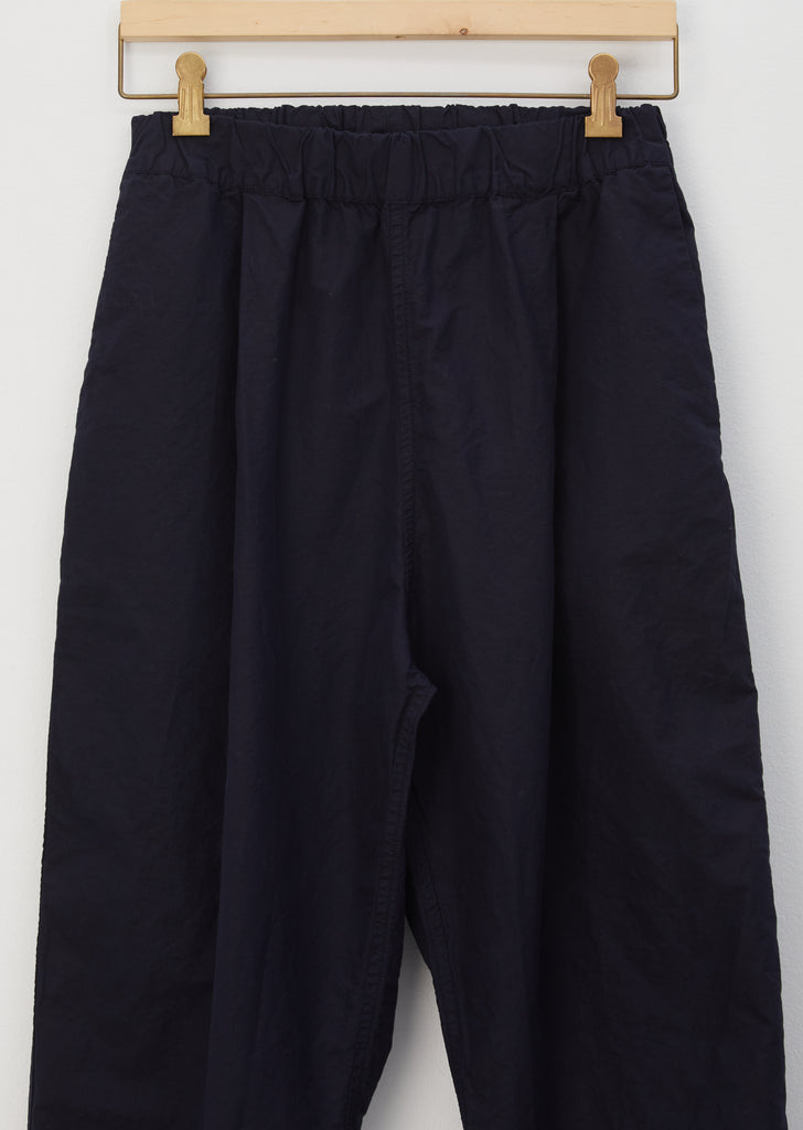 Casey Casey Verger pants in navy lightweight cotton with signature wash. These easy pull-on trousers have a slouchy fit with a flattering cropped, tapered leg and features a wide elastic waistband.