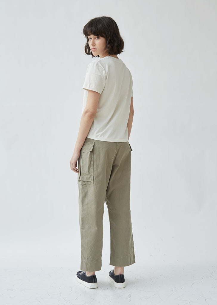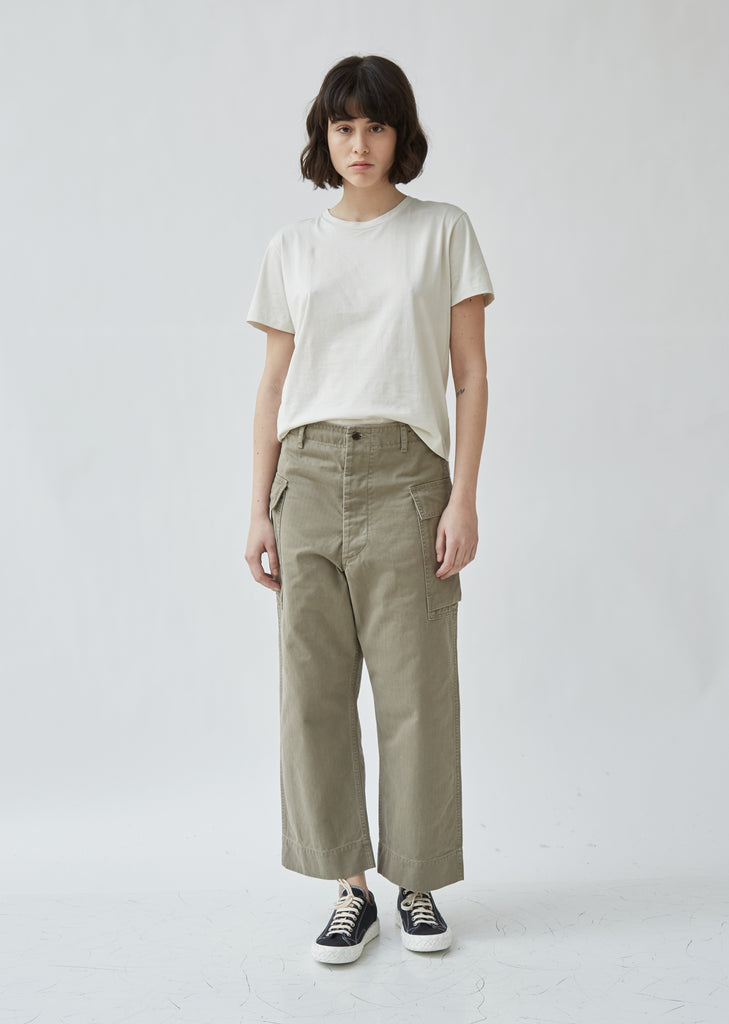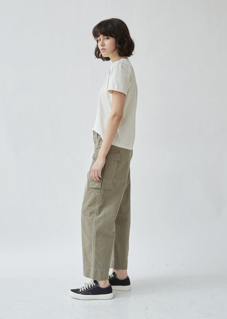 Signature khaki green cropped field cargo trousers in a mid-weight cotton. Classic cargo-style pant styling. Square patch pockets on front to back with button-thru flap. Belt loops on waistband. Finished with tonal white button and zipper-fly. Relaxed fit.