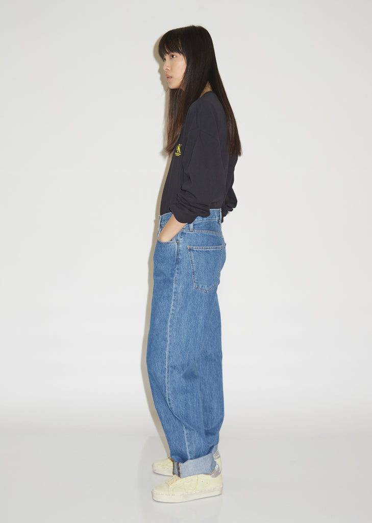 The label's vintage-inspired baggy leg jeans in tough blue, crafted from sturdy cotton denim. This jean features 6-pocket styling and a leather EST. 1978 logo patch in back. Detailed with a zipper fly, engraved button closure, and belt loops at the waist. Color: Tough Blue. 100% Cotton. Imported.