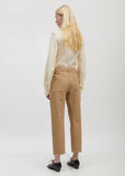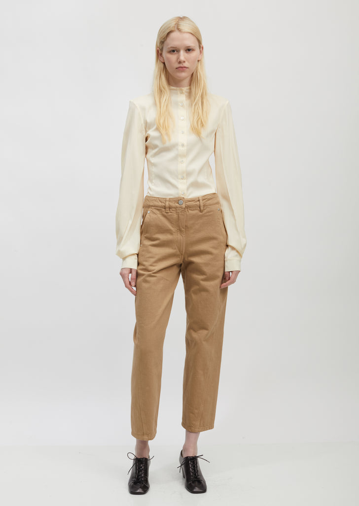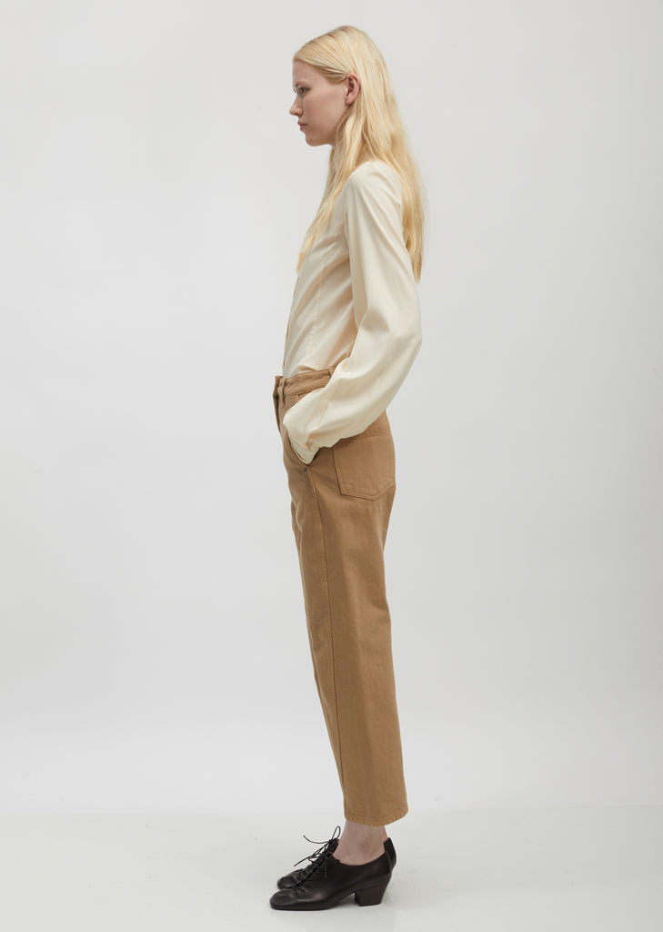Lemaire Twisted pants in garment dyed beige denim. One of Lemaire's bestselling styles, it features a flattering twisted seam leg opening and sightly high-waisted fit.  Perfect for daily wear, the denim will soften with wear and mold to your frame.