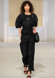Lemaire Curved Pants in black cotton is a new clean, flat front pant from the runway collection, featuring Lemaire's signature curved seaming at front and at center back for a balloon effect with a higher waist for a flattering fit. Coordinates back to the Blouson Shirt Jacket for a complete look.