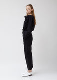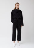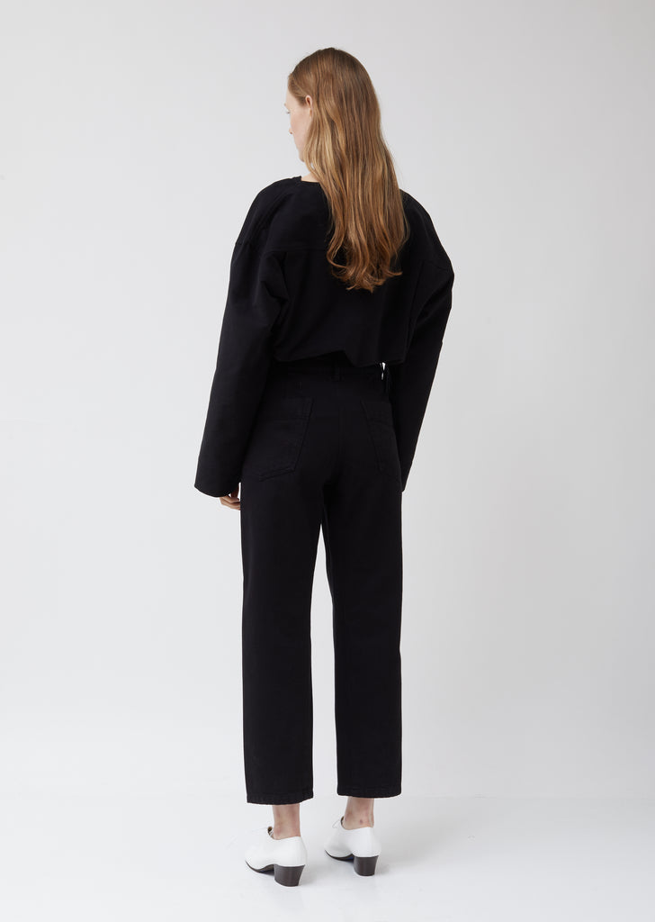 Garment-dyed black denim trousers featuring a straight, cropped legs and twisted outseams. Mid-rise. Set-on waistband. Belt loops. Button/zip front closure. On-seam side pockets adorned with metal rivets. Silver-tone metal hardware throughout. Button-through patch back pockets; tonal horn buttons. Contrast white top-stitching throughout. Cropped above ankle. Relaxed fit.
