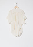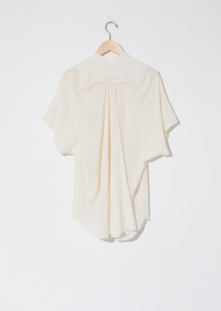 Pas de Calais Crinkled Henley Blouse in Ivory. Crafted of a linen-lyocell blend fabric dyed with white birch dye from Hokkaido, Japan — wide dolman short sleeve buttoned henley blouse with a mandarin collar. Features ruching detail along shoulder and center back.