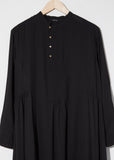 Pas de Calais Chinese Collar Ruched Dress in Black. Crafted in cotton, long sleeve dress with a button henley on a mandarin collar. Featuring a slightly raised waist with shirring detailed full skirt at front, and full gathering at back. Comes with a separate slip dress in black cotton.