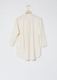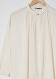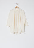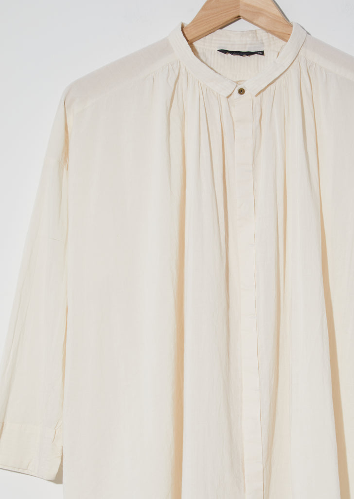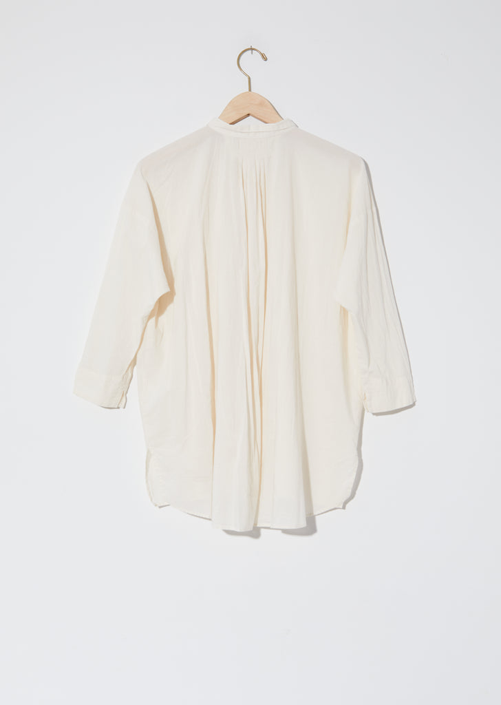Pas de Calais Cotton Blouse in White. The Japanese label's signature cotton blouse with buttoned front on a hidden placket. Features a small notch collar, shirring at neckline, and single exposed button. Three-quarter length sleeves. Accented with micro-tucks at back neckline for subtle fullness at back.