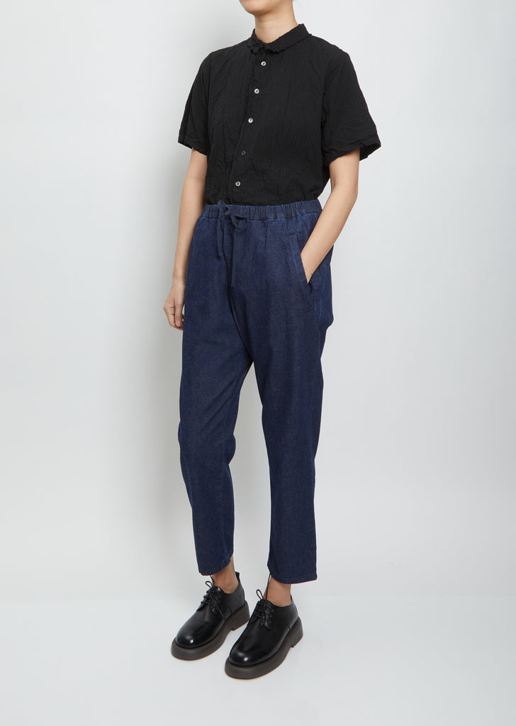 Pas de Calais indigo drawstring pull-on trousers in a denim cotton and hemp blend.