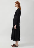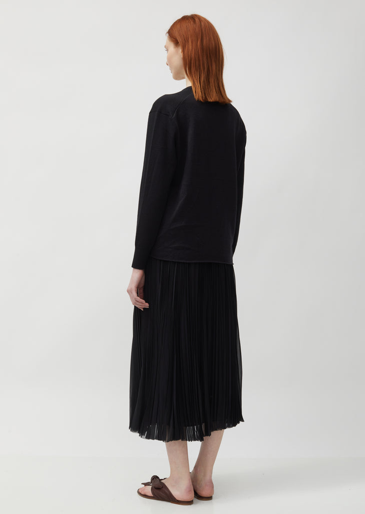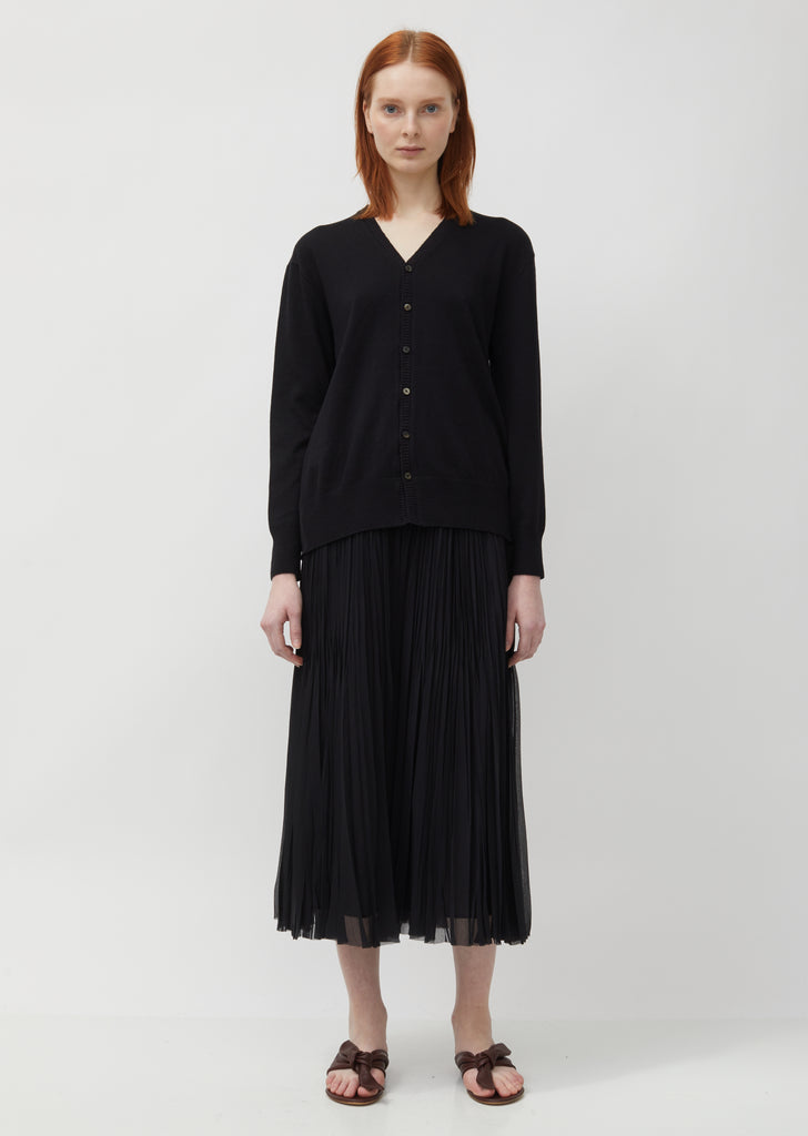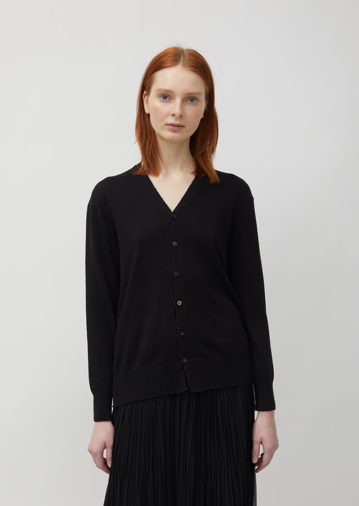Black button-front knit cardigan stockinette-stitched from cotton-silk-blend yarn. This V-neck style features a back body panel in a separate, cotton-wool blend.