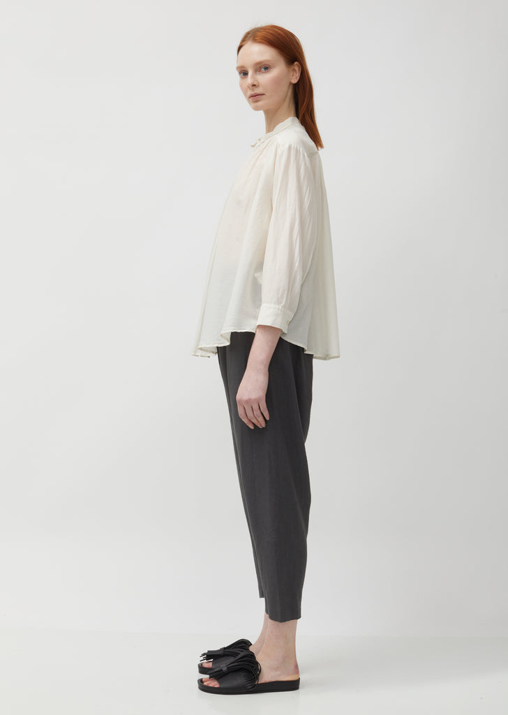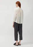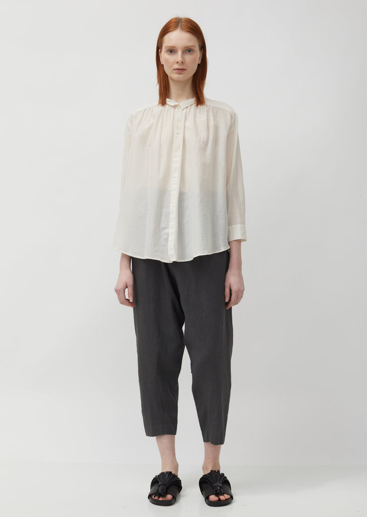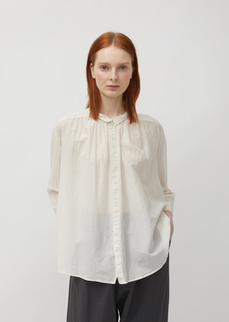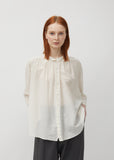 White bracelet-sleeve button-front blouse in cotton-silk voile, finished with gathering at the saddle shoulders.