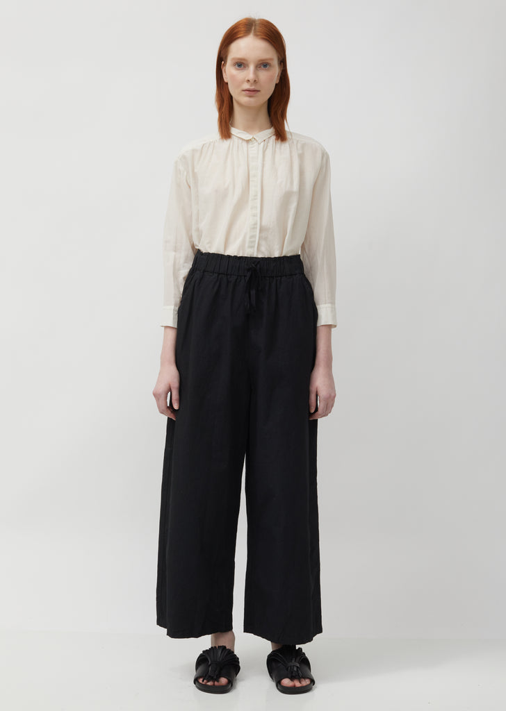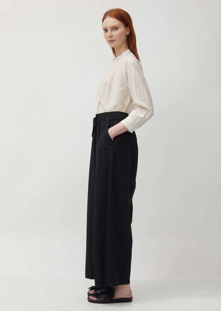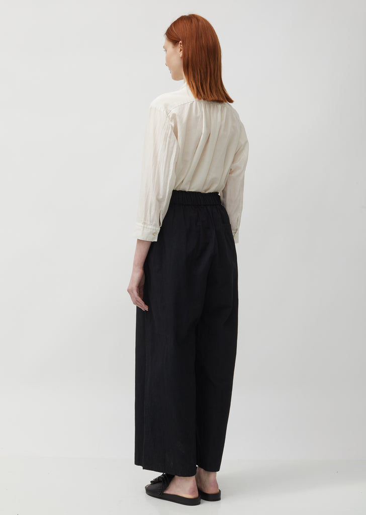 Black pull-on wide-leg trousers cut from heavy cotton poplin, featuring a drawstring waist and three-pocket styling.