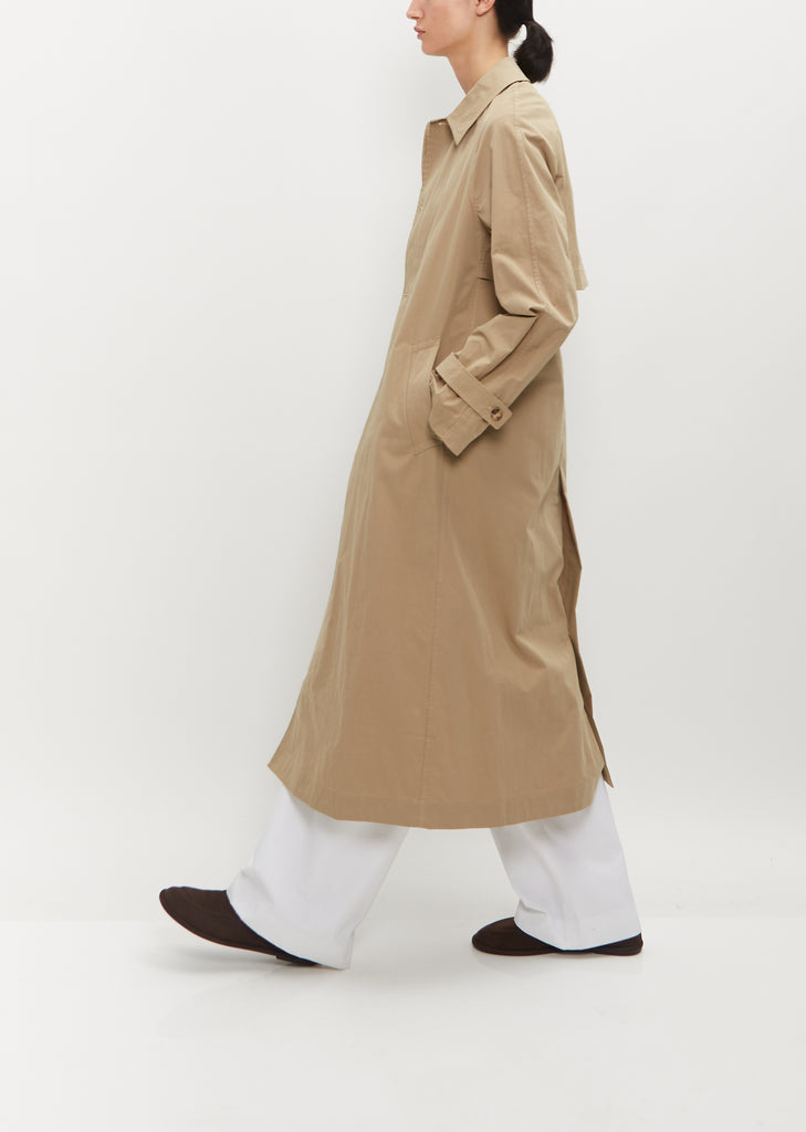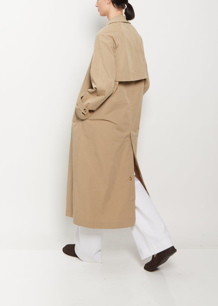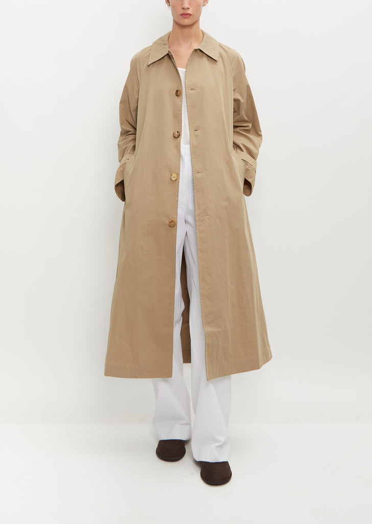 6397 essentials khaki long classic trench coat in lightweight technical cotton blend gabardine. Features raglan shoulders, spread collar, tab cuffs, and welt side pockets. Finished with shell buttons. This jacket comes unlined.