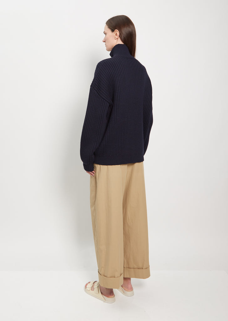 6397 navy cardigan with a high neck in ribbed mid weight merino wool. Features dropped shoulders, exposed silver tone front zip, and continuing rib trim finish along neck, cuffs, and hem.
