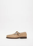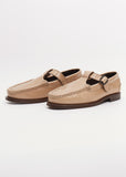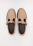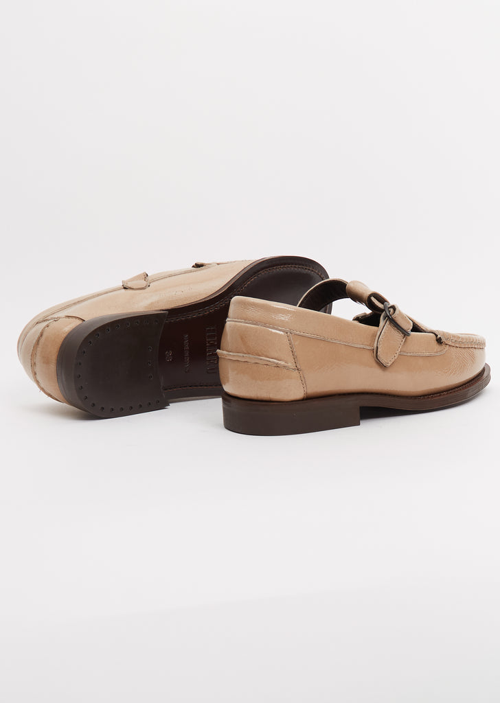 Hereu sand T-bar loafer with an adjustable buckle fastening crafted in Italian crinkled glossy lambskin. Hand-sewn using the traditional moccasin construction. Fully lined in leather with leather outsole and stacked leather heel.