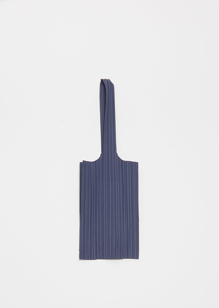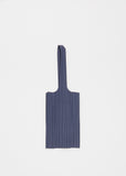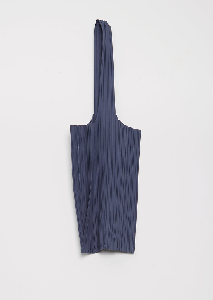 Pleats Please blue grey pleated tote bag features single strap and small inverted side pleats for expansion.