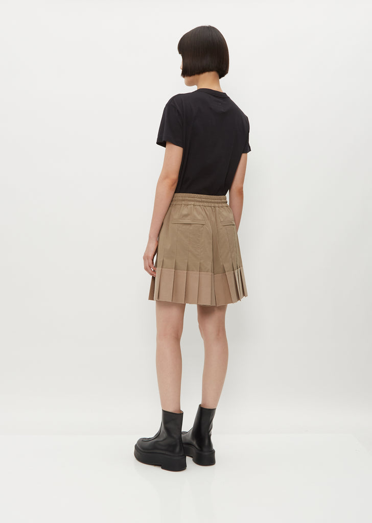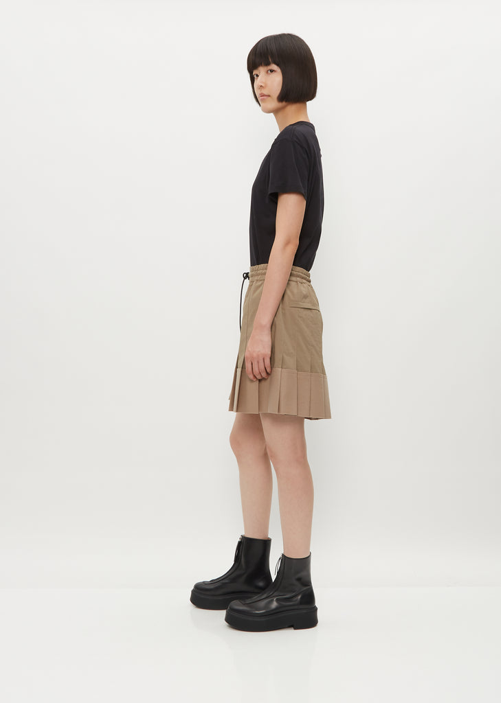 Sacai beige shorts with seamed fronts opening to pleated hems in twill and wool. Features a clean front waistband with elasticized sides and back, contrast black drawstring, concealed side pockets, and rear welt pockets. This shorts come lined.
