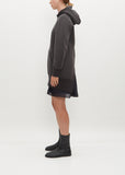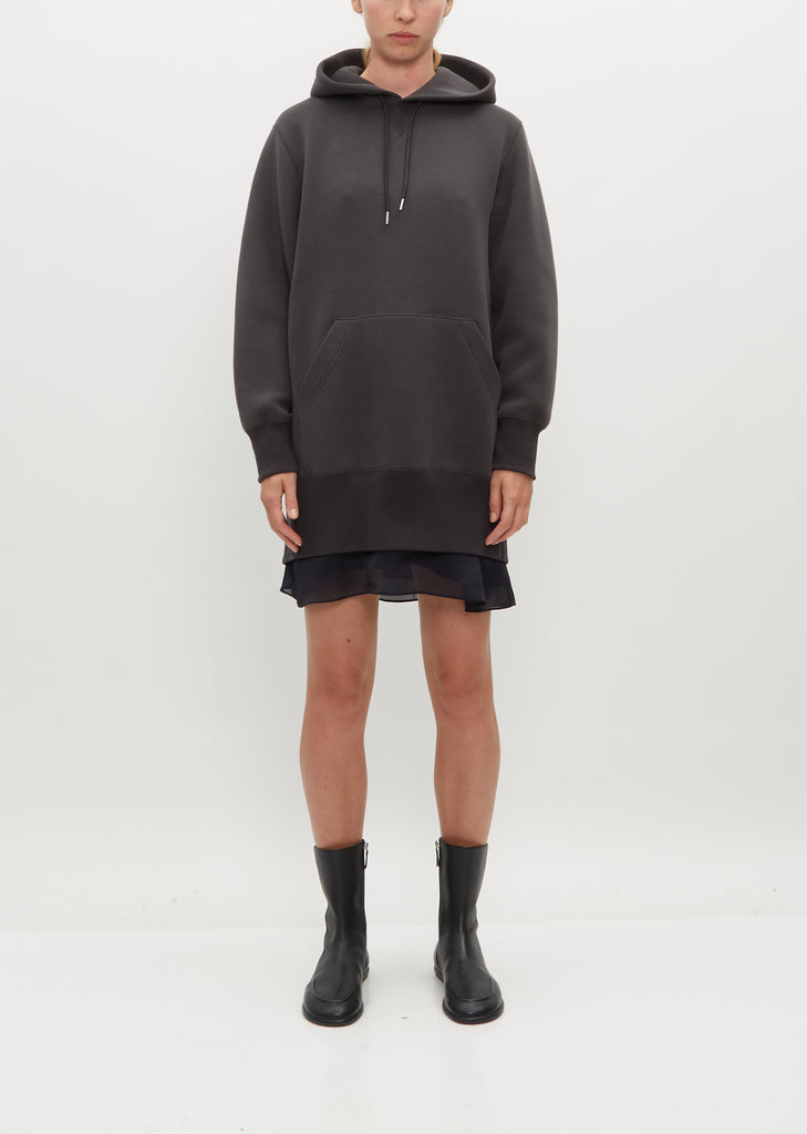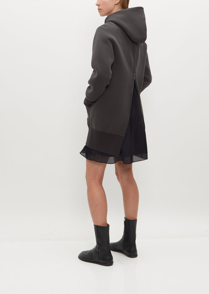 Sacai grey long sweatshirt with hood in signature sponge sweat jersey. Features a chiffon dress underlay, concealed center back zip, and single front pouch pocket. Detailed with black drawstring with metal tips to adjust hoodie. Silver-tone hardware throughout.