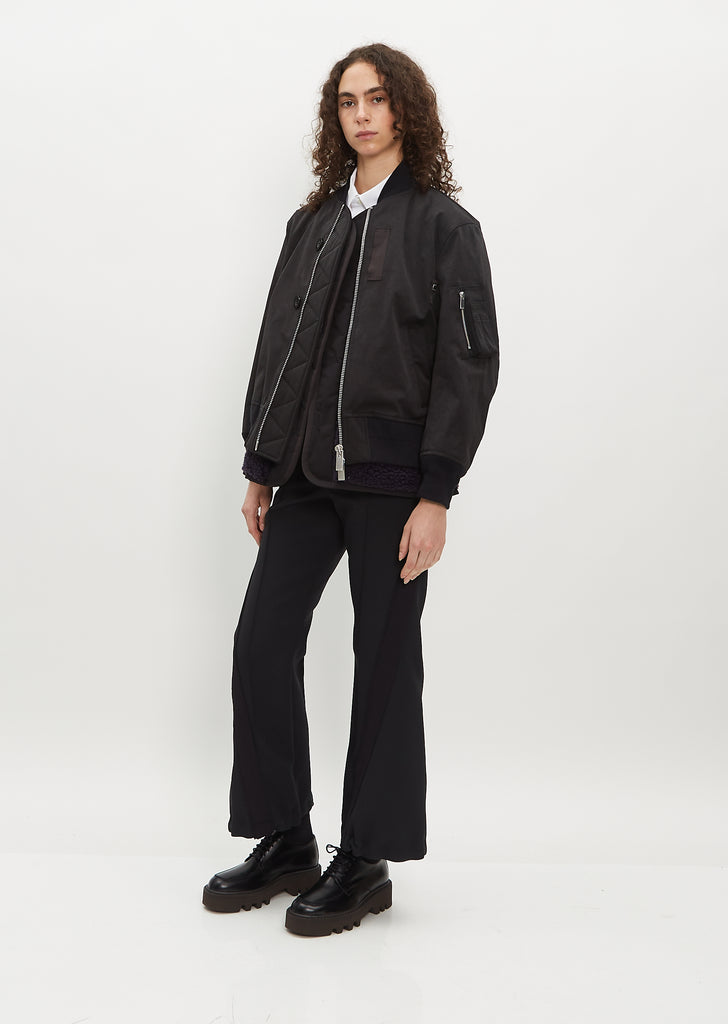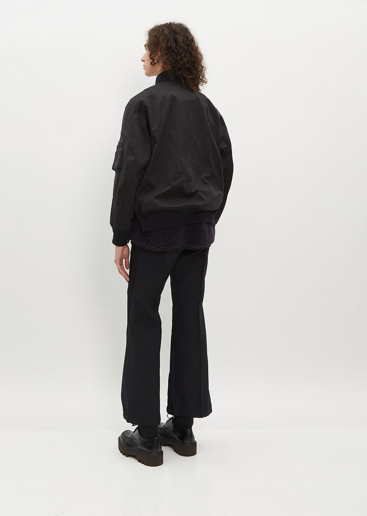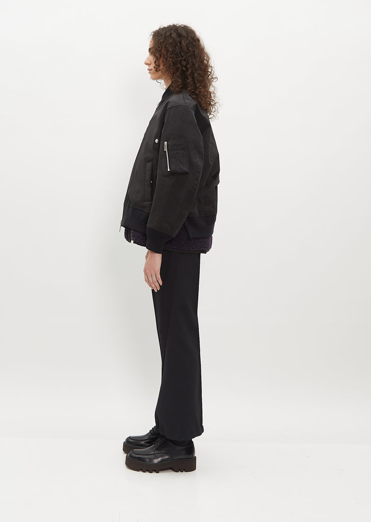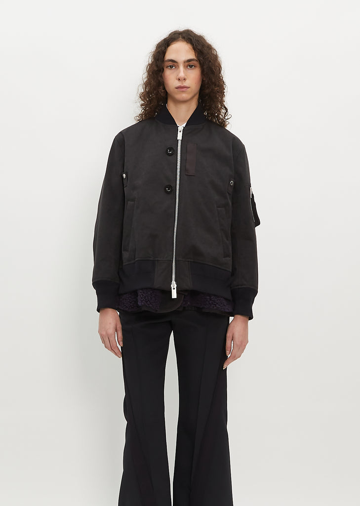 Sacai black bomber jacket with a blouson fit in faux suede. Features a zipper pocket on arm, welt side pockets, and ribbed trim finish along collar, cuffs, and hem.
