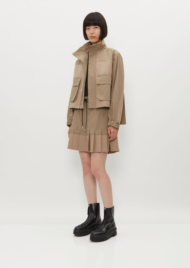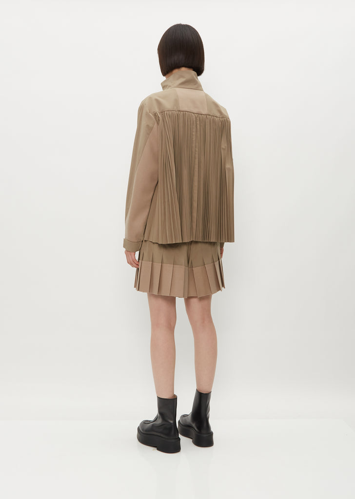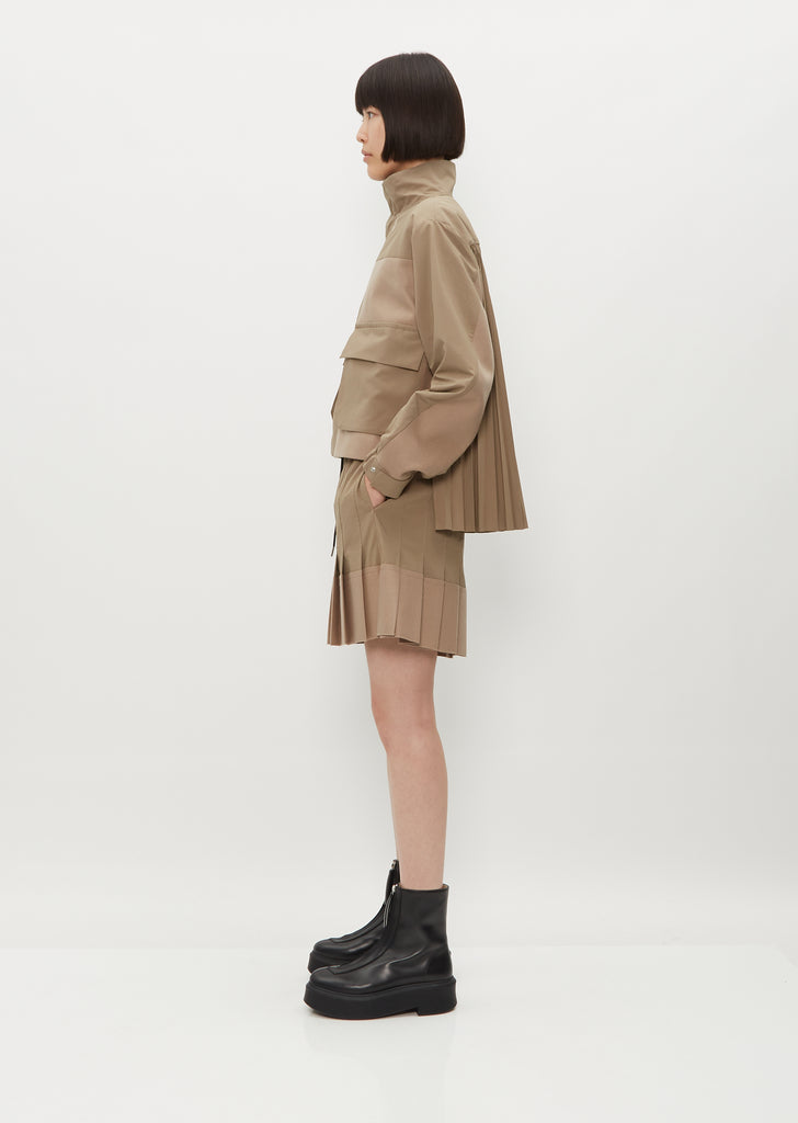Sacai beige jacket with a cropped fit and pleated back in twill and wool. Features a high neck, large patch flap pockets, elasticized cuffs, and a longer back hem. Finished with a concealed zip front closure.