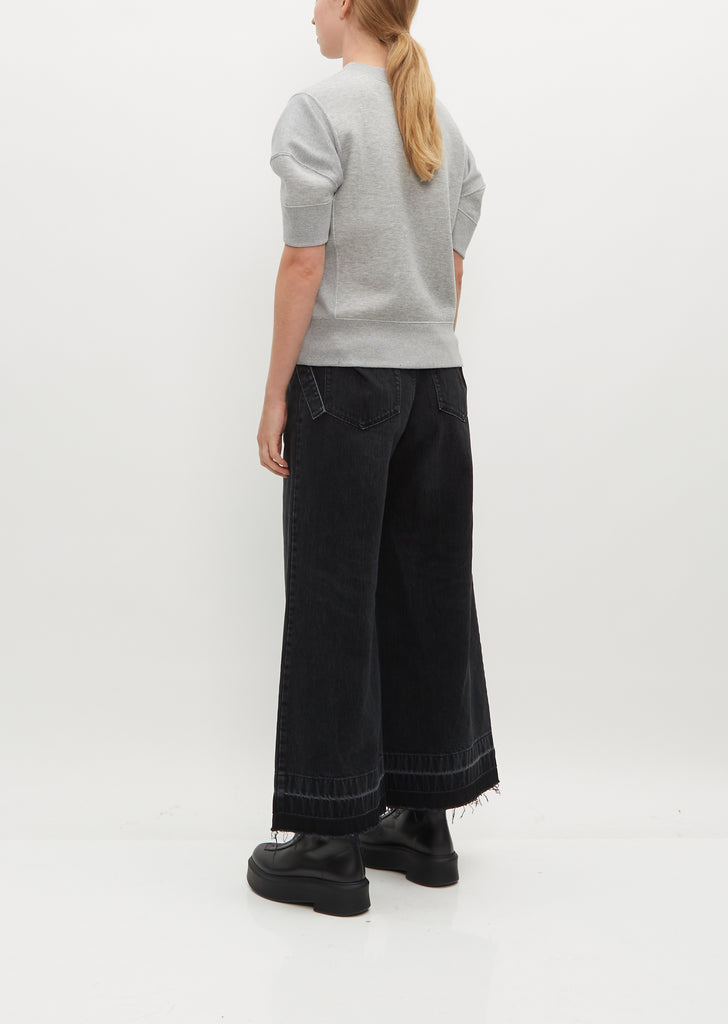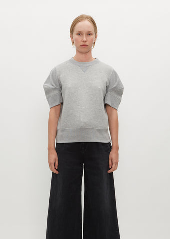 Sacai grey short sleeve sweatshirt in signature sponge sweat jersey. Features a round neckline, ribbed side and shoulder gussets, and ribbed trim finish along neckline, sleeves, and hem.