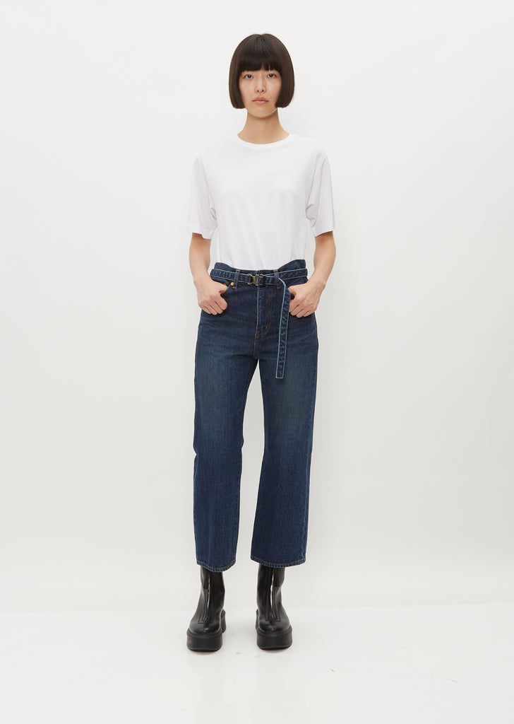 Sacai blue boot cut leg jeans with a mid-rise fit in cotton denim. Removable self belt with buckle fastener. 5-pocket styling with zippered interior front pocket. Button and zip-fly fastening. Silver-tone hardware. Relaxed fit.