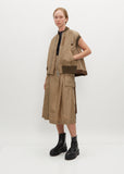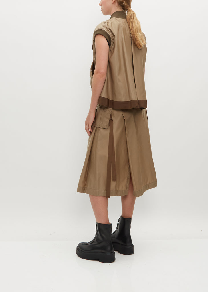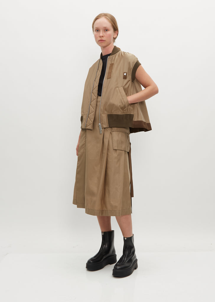 Sacai dark beige vest with contrasting details in a nylon twill. Features elastic ribbed collar, cuffs and hem, two side welt pockets, decorative side silver buttons, 100% Cupro lining and a front two-way zip fastening.