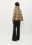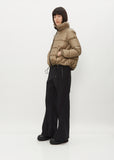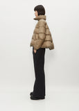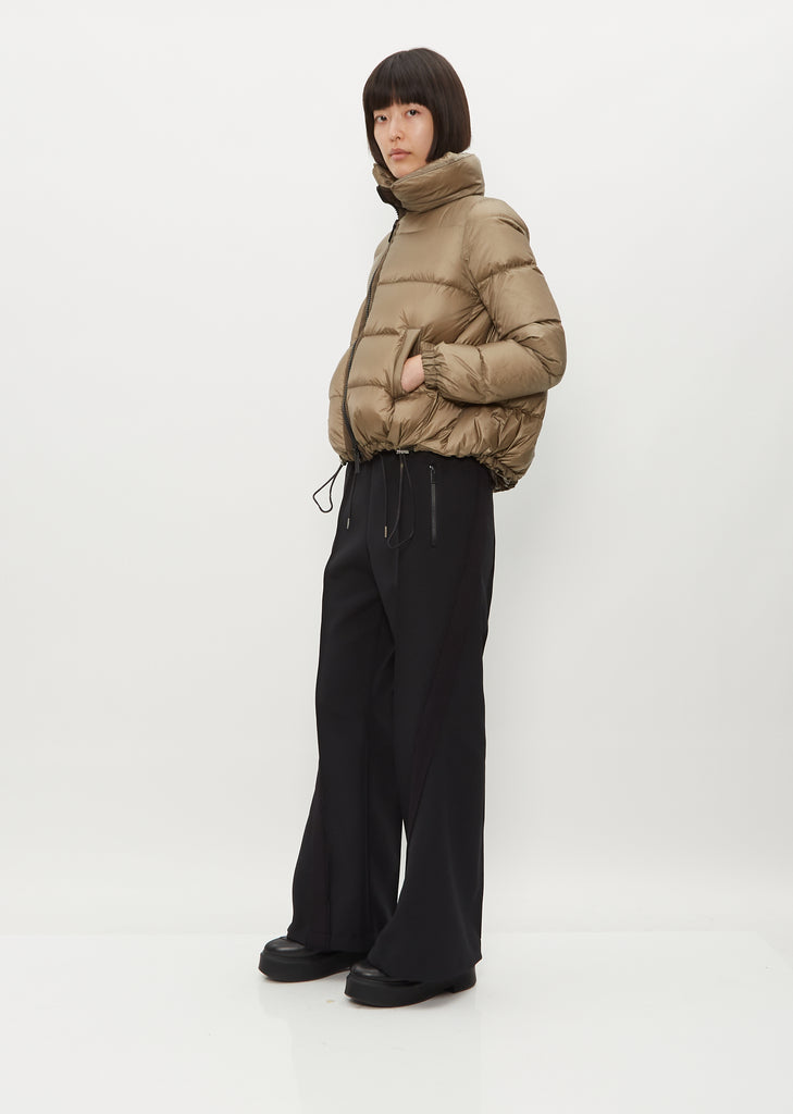 Sacai dark beige short puffer jacket with a high neck and asymmetric front zip in smooth technical fabric. Features adjustable toggle drawcords on either side of hem, welt side pockets, elasticized cuffs, and a contrast dark brown two-way zip.