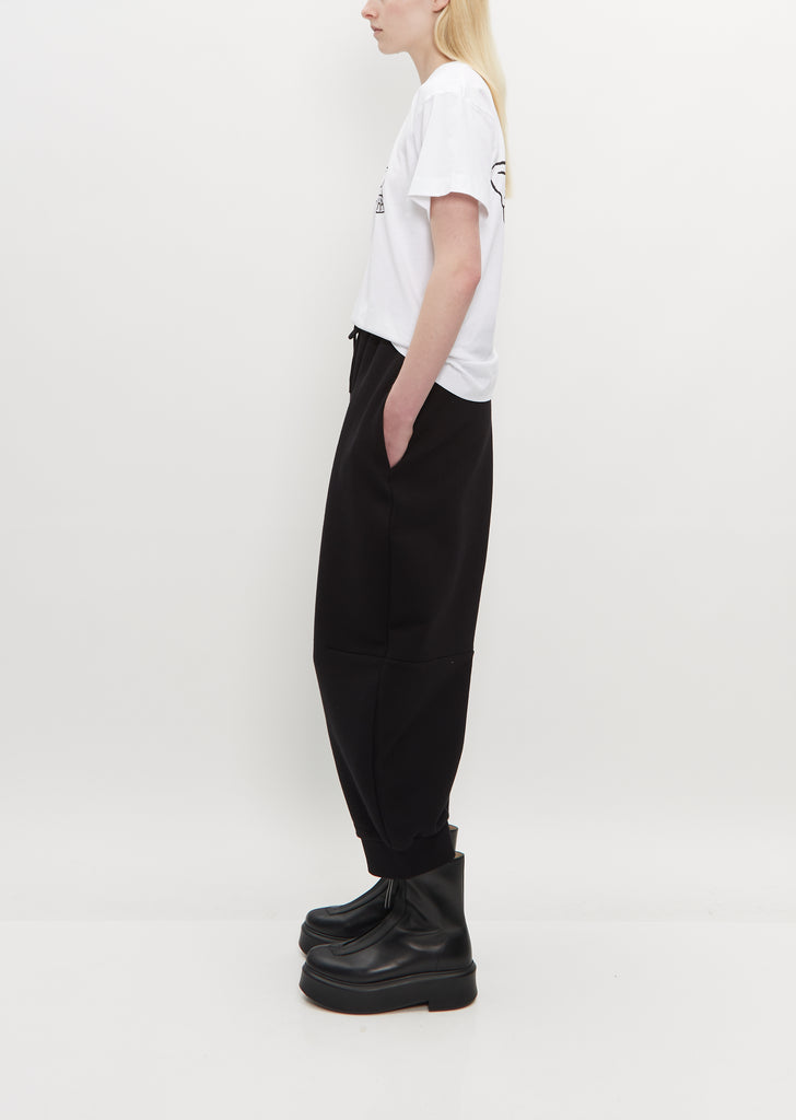 Simone Rocha black tapered joggers with a wide leg silhouette and daisy emblem detail made in cotton sweat shirting. Features single back patch pocket with faux pearl daisy emblem, angled side pockets, tonal waist tie, and rib trim finish on cuffs. Pull on fit.