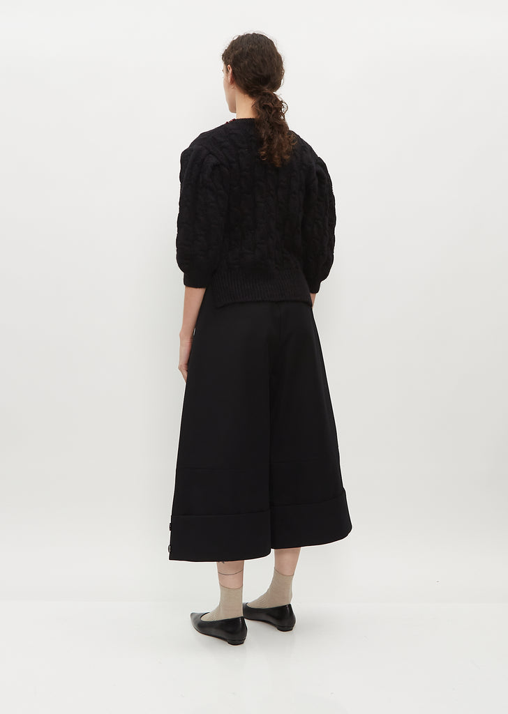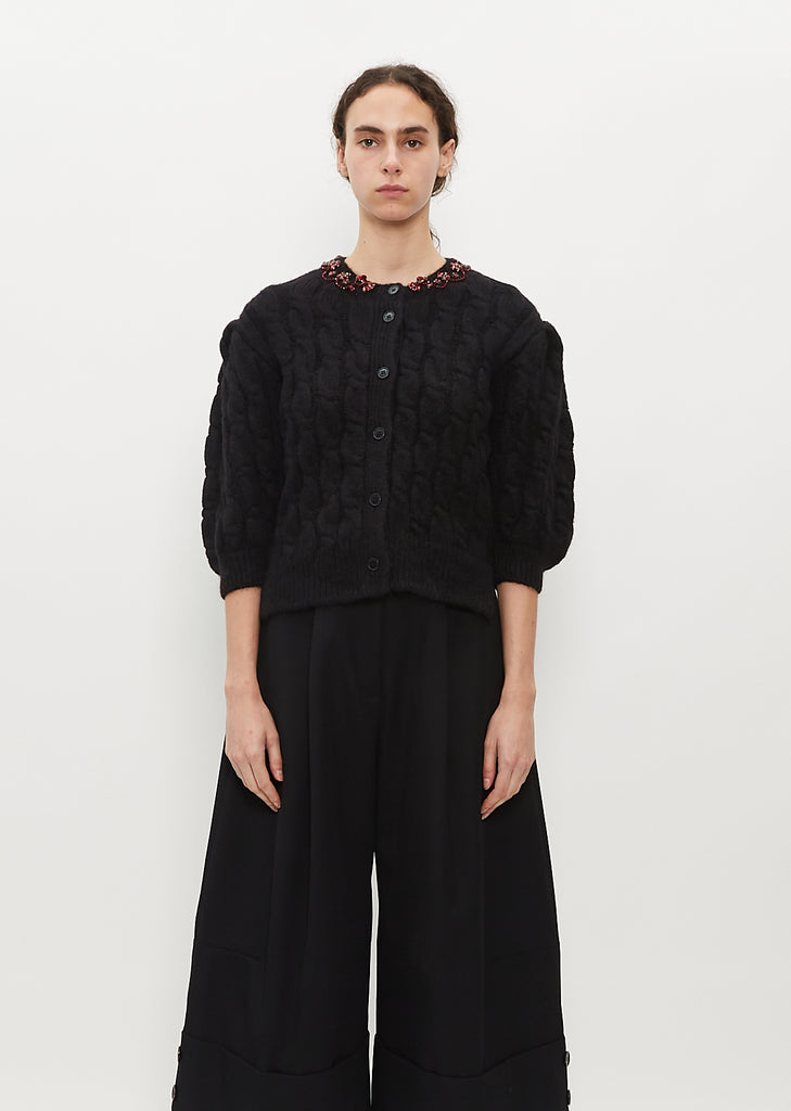 Simone Rocha black cardigan with blood red beaded embellishments in a chunky wool alpaca blend cable knit. Features three quarter length puff sleeves, round neckline, and crystal embellishments along the neckline. Finished with tonal buttons and rib trim on collar, placket, hem, and sleeves.
