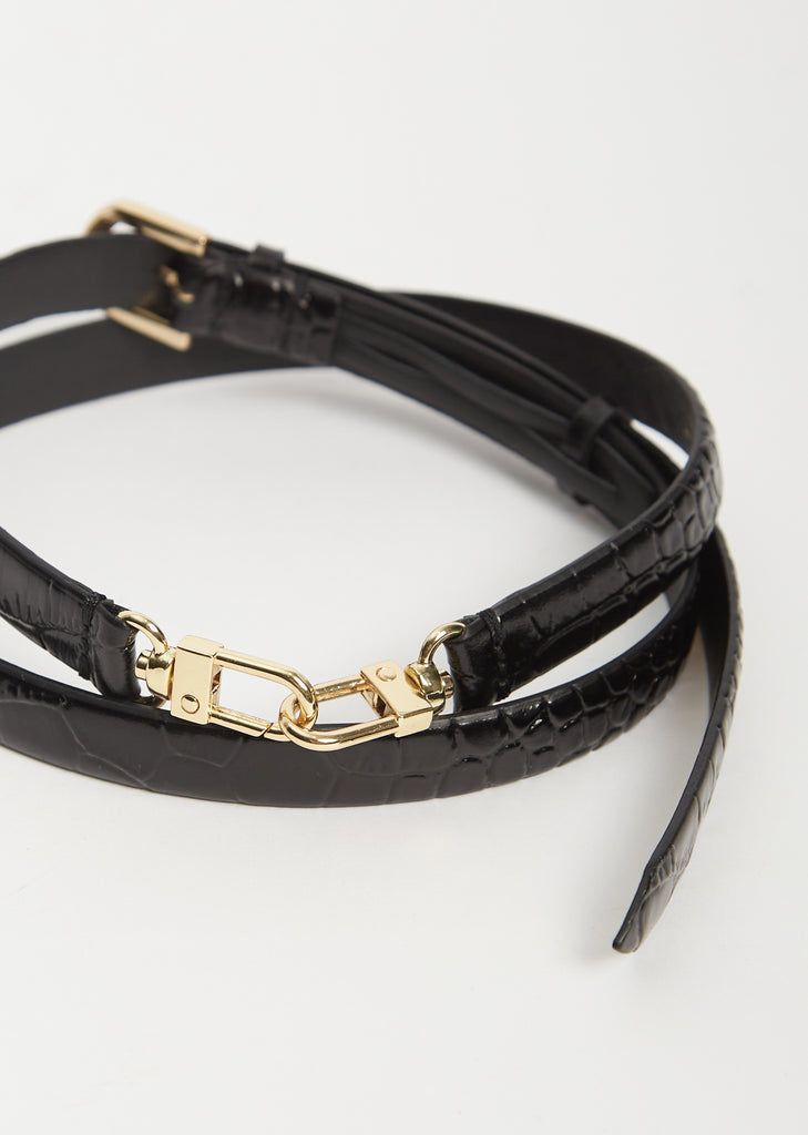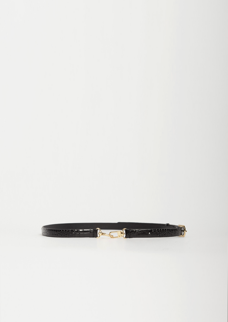 Totême black slim belt accented with brand's distinctive double clasp in golden metal and crafted in Italy from responsibly sourced leather. Features a de-bossed crocodile pattern and comes in a single size that can be adjusted between 75cm and 95cm.