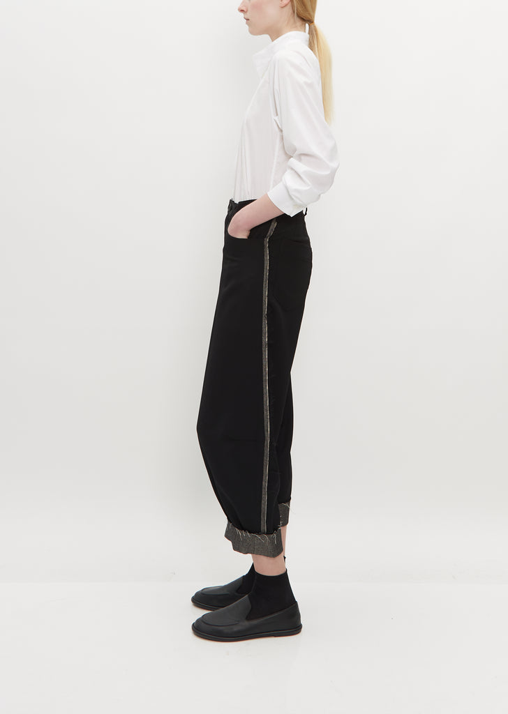 Y's by Yohji Yamamoto black cropped, wide leg pants in wool gabardine. Features raw edges along hem and sides, angled side pockets, back patch pockets, and a concealed zip with button at top.