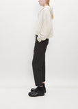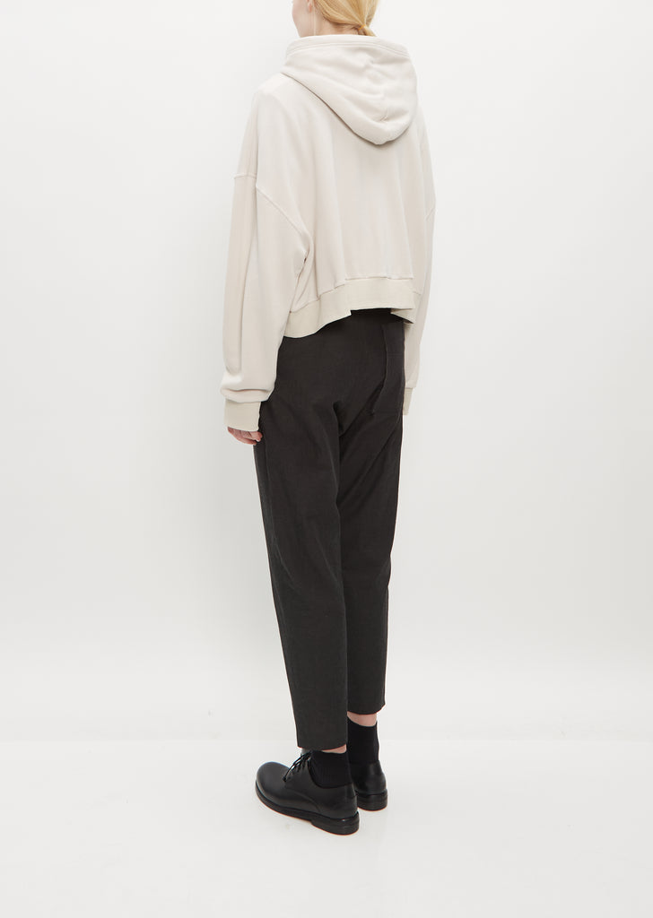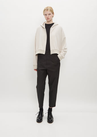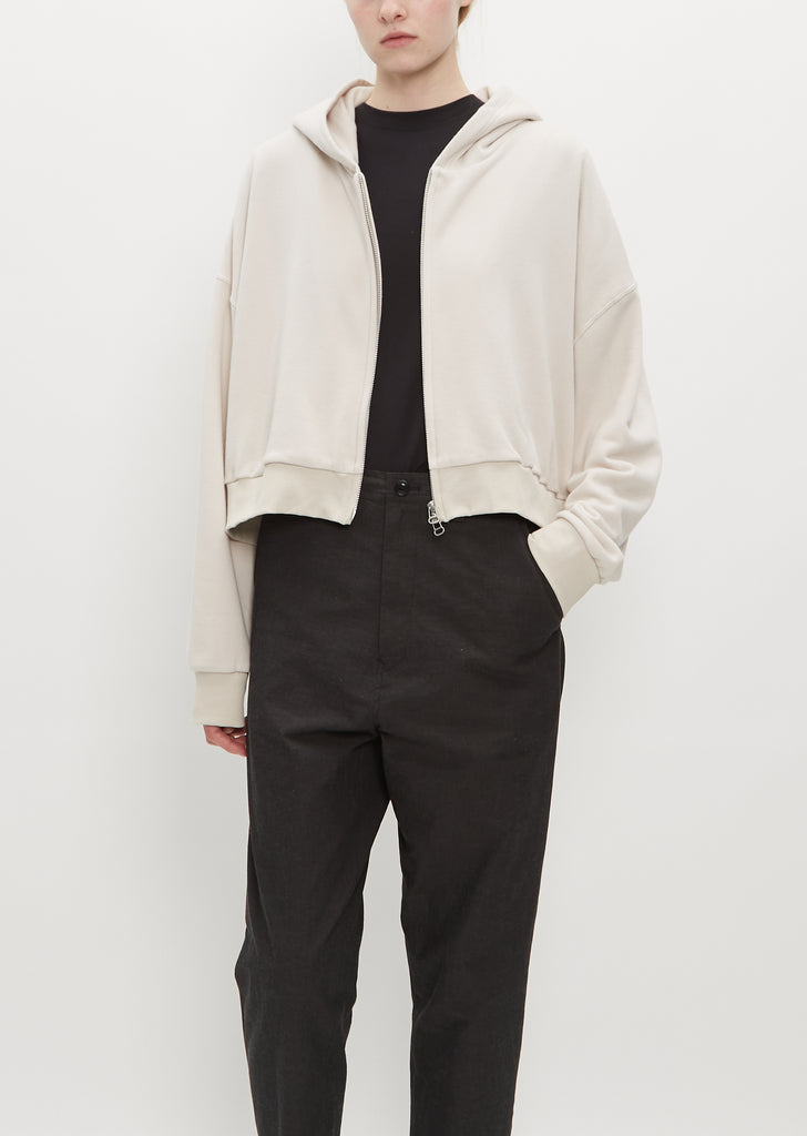 Y's by Yohji Yamamoto beige sweater with a cropped, boxy fit in French Terry cotton. Features a hood, rib trim finish along hem and cuffs, and finished with a silver toned two-way zip.