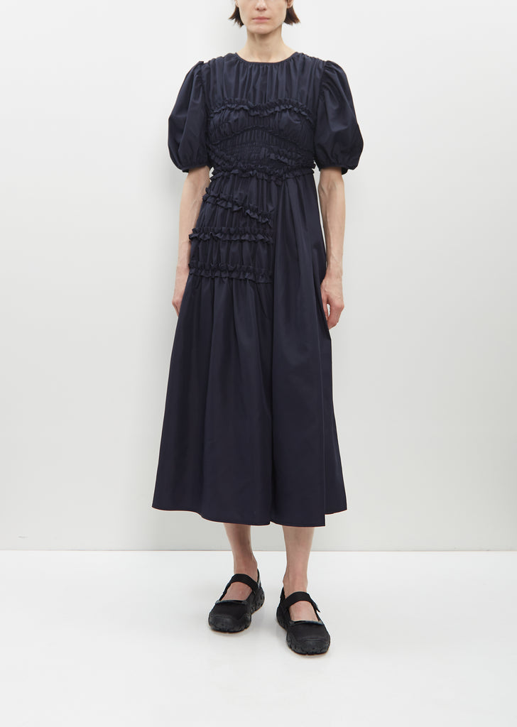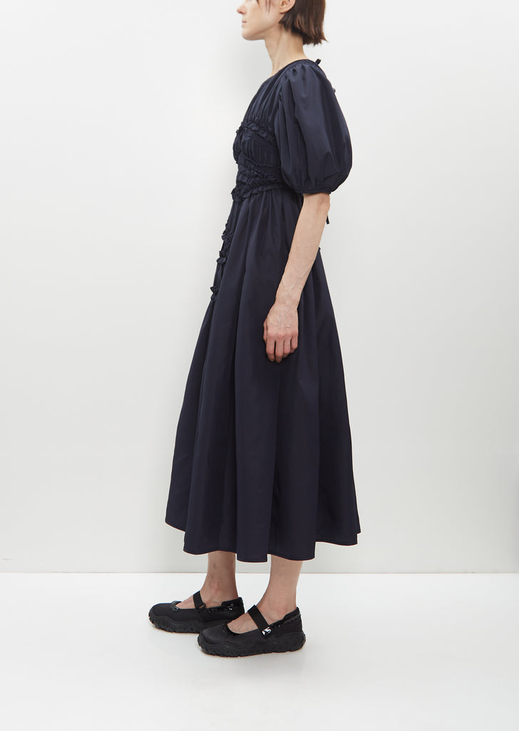 Cecilie Bahnsen navy puff sleeve dress in recycled smocked faille. Features ruffle details throughout and a three tie closure at back.