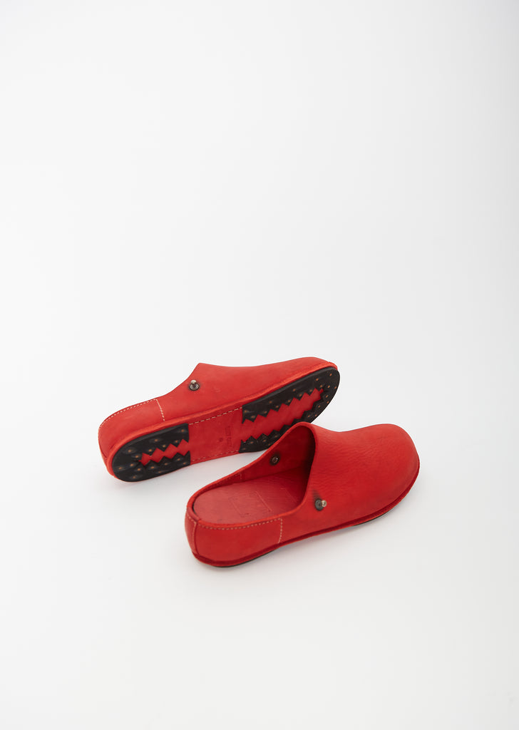 Casey Casey x Guidi red slip-on clog with tonal heavy stitching in premium full grain leather. Features a rounded toe, decorative metallic studs and nails, a reinforced padded insole and signature notched sole crafted in rubber and leather.