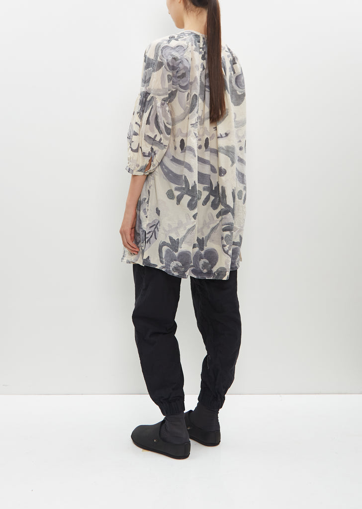 Brand Signature Piece — Casey Casey grey and natural hue printed collarless button-down shirt with dropped balloon sleeves on a raglan shoulder in washed mid-weight paper cotton. Features in-seam front pockets and gathered detailing at front and back neckline for a flared, oversized fit. Panel Construction. Finished with tonal corozo buttons.