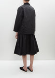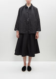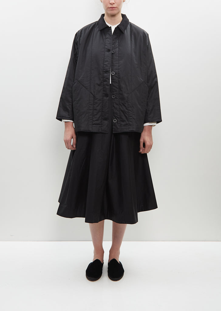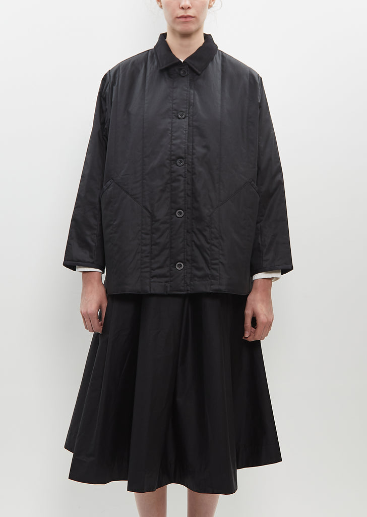 Casey Casey black lightly padded jacket with contrast fleece collar and tone on tone piping throughout in laquer coated cotton. Features tonal corozo button-front, angled patch pockets, and a single interior patch pocket.