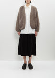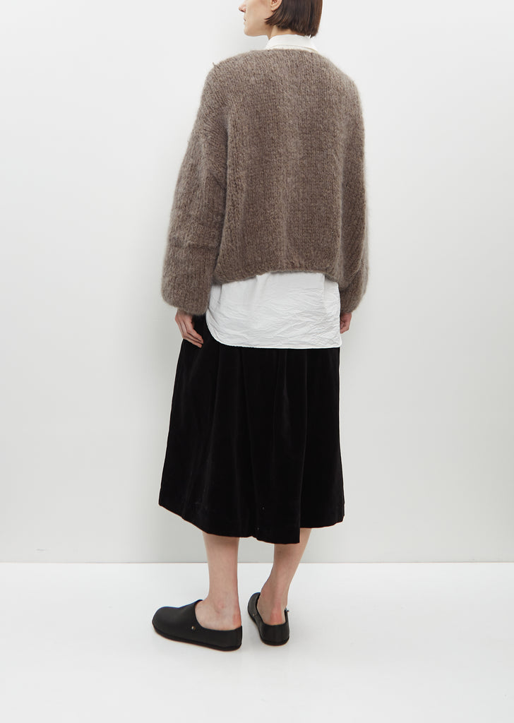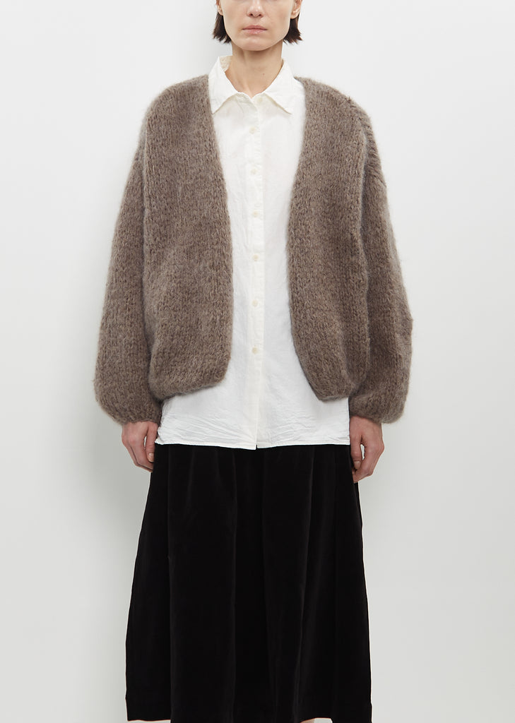 Casey Casey khaki cropped cardigan with an open front handknitted in soft mohair blend open knit. Relaxed fit.